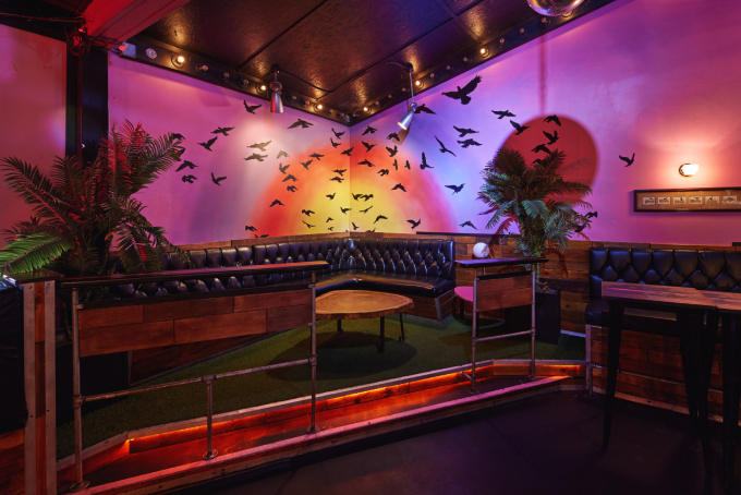 Here, the bar lives at the center of the room and is surrounded by cozy booth seating and an intimate standing dance floor area that adjoins the corner pocket DJ booth.