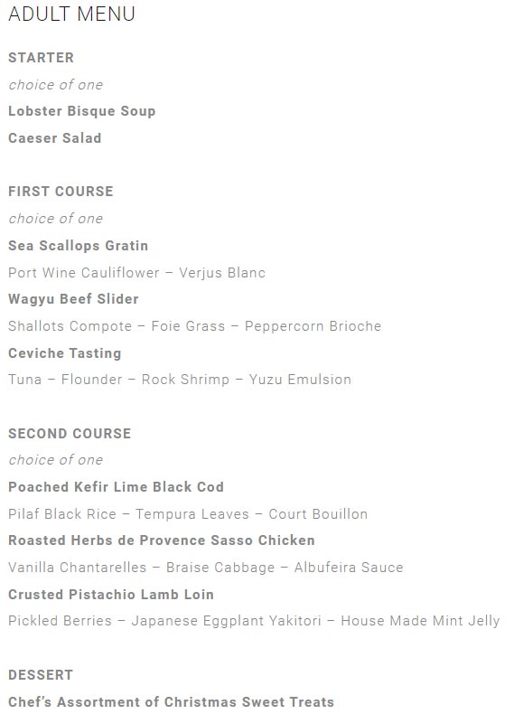 The special Christmas Eve dinner at Naked Crab at B Ocean Resort, available on December 24, features menu highlights such as Crusted Pistachio Lamb Loin with pickled berries, Japanese eggplant yakitori and house-made mint jelly, as well as Roasted Herbs de Provence Sasso Chicken complemented by vanilla chantarelles, braised cabbage and Albufeira sauce. A special menu for kids is also available including a petite filet served with mashed potatoes and green beans. Adults can enjoy the Christmas Eve menu for $75++ per person and children under 12 for $45++ per person.