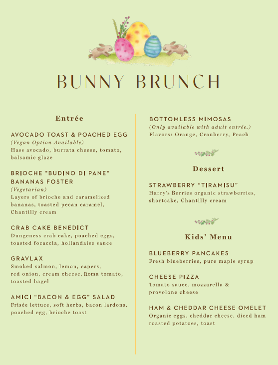 Trattoria Amici in Glendale is hosting an Easter Bunny Brunch at The Americana at Brand on April 5. Guests can expect a family-friendly Italian feast, bottomless mimosas for adults, and goodie bags for children. The experience includes a visit from the Easter Bunny. Tickets are $69 for adults (ages 13+) and $36 for children (ages 12 and under), with tax and gratuity included.