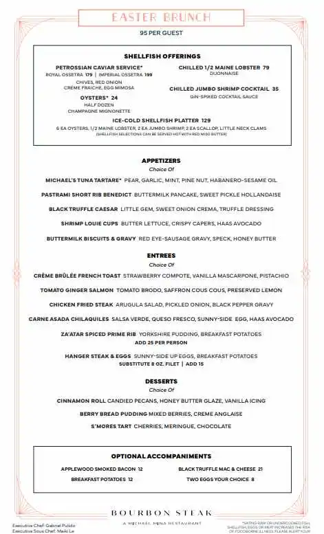 Bourbon Steak Los Angeles in Glendale is offering a three-course prix-fixe Easter Brunch on April 20 from 11 AM to 2 PM for $95 per person. The menu features dishes such as tuna tartare, crème brûlée French toast, chicken fried steak, and cinnamon rolls, with optional shellfish add-ons including caviar and oysters.
