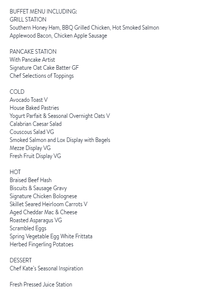 1 Kitchen in Nashville is offering a buffet from 10 AM to 5 PM with pricing at $69 for adults and $35 for children ages 3–12. Menu highlights include a grill station with ham, BBQ chicken, smoked salmon, an oat pancake station, braised beef hash, chicken Bolognese, and dessert from Chef Kate.
