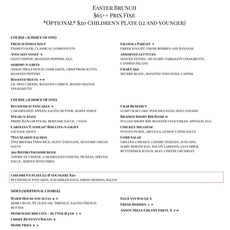360 Bistro in Nashville is serving a $65 two-course prix-fixe brunch from 10 AM to 3 PM. First-course options include French onion soup, assorted lettuces with candied pecans, and shrimp and grits with prosciutto. Second-course choices include crab benedict, steak and eggs with béarnaise, and buckwheat pancakes with caramelized apples. Sides such as house focaccia and Benton’s bacon are available. A $20 kids’ plate includes pancakes, scrambled eggs, berries, and bacon. Vegetarian and gluten-free options are offered. Dinner service will follow the brunch period.