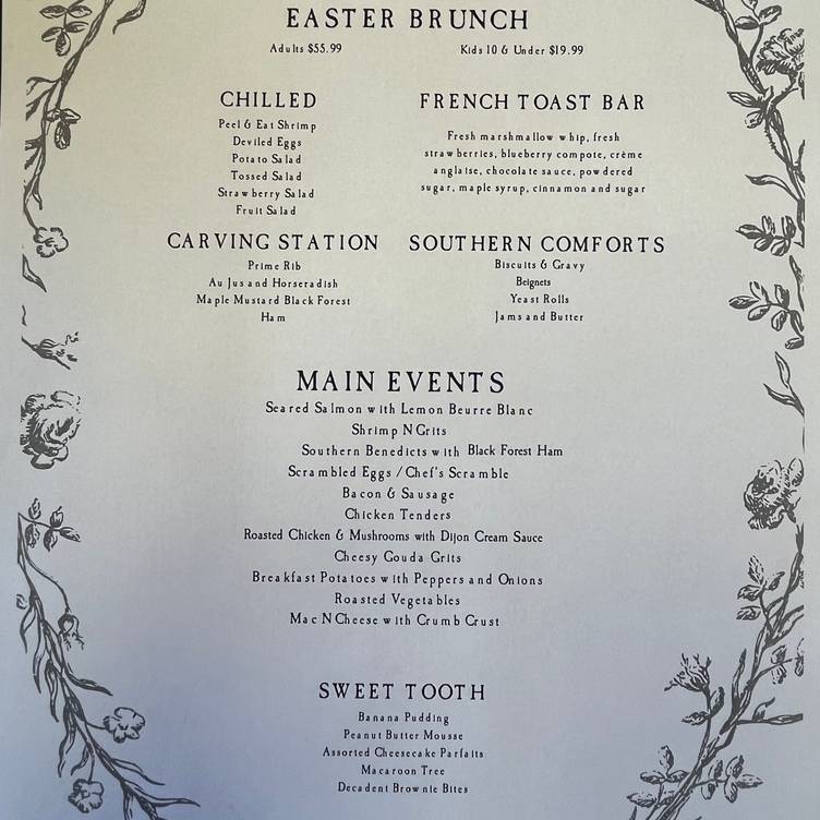 The Honeysuckle in Franklin is serving a traditional Easter buffet for $55.99 per adult and $19.99 for kids 10 and under. While a full menu has not been provided, the restaurant typically offers upscale Southern-style dishes, including carved meats, brunch classics, and dessert options in a refined setting.