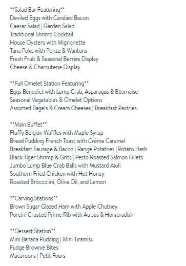 Church and Union in Nashville is offering a brunch buffet from 9 AM to 4 PM at $75 per adult and $35 for children 12 and under. A Bloody Mary or mimosa is included.