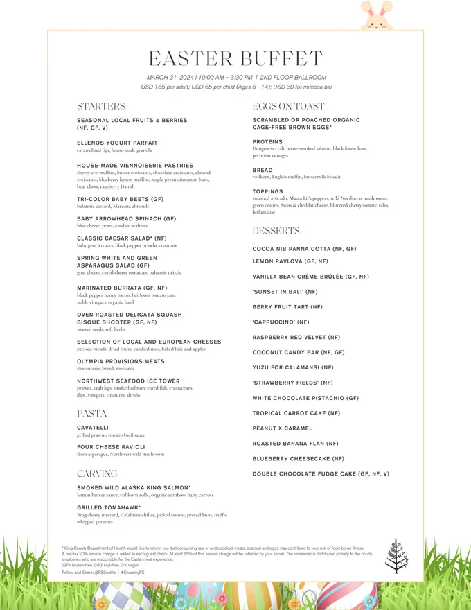 Events at Four Seasons Hotel Seattle is offering an Easter buffet on Sunday March 31. Priced at $155 for adults and $65 for children 5-14.