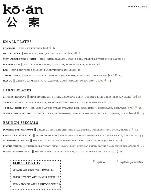 Kō•än (Cary) is offering an Easter brunch menu on April 9. Their menu explores bright, adventurous flavors using local and seasonal ingredients along with an exquisite wine list, lively craft cocktails & mock-cocktails, and a uniquely curated sake selection.