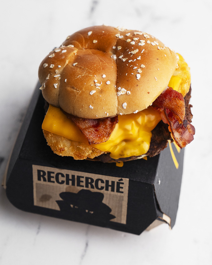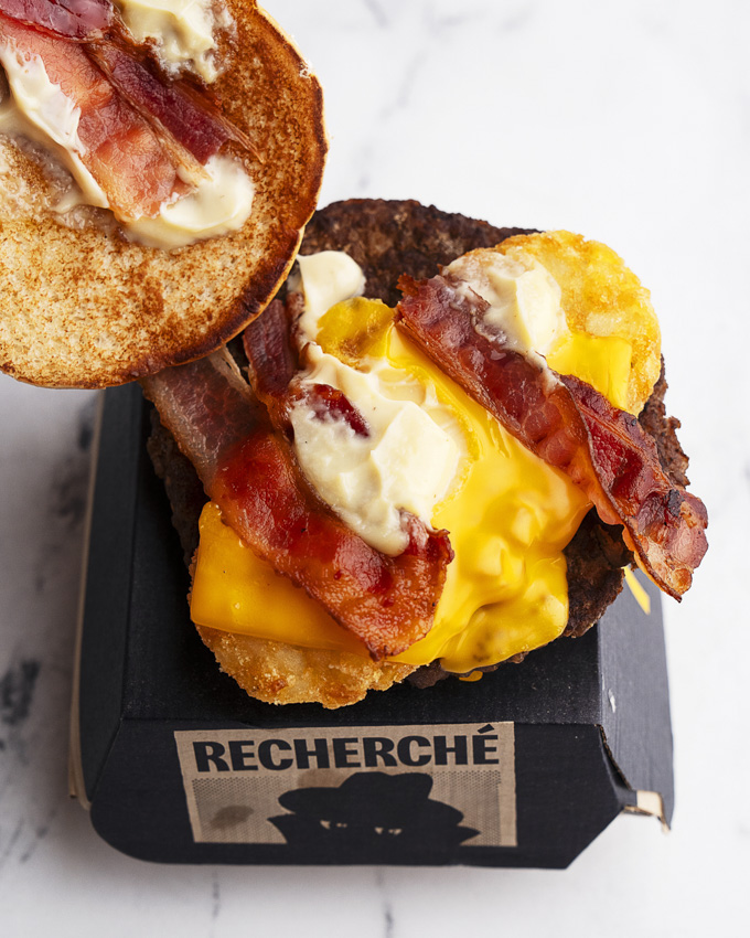 From Germany, the Big Rösti layers a beef patty with hickory-smoked bacon, processed cheese, cheese sauce, and a crispy Rösti-style hash brown on an oat-topped bun.