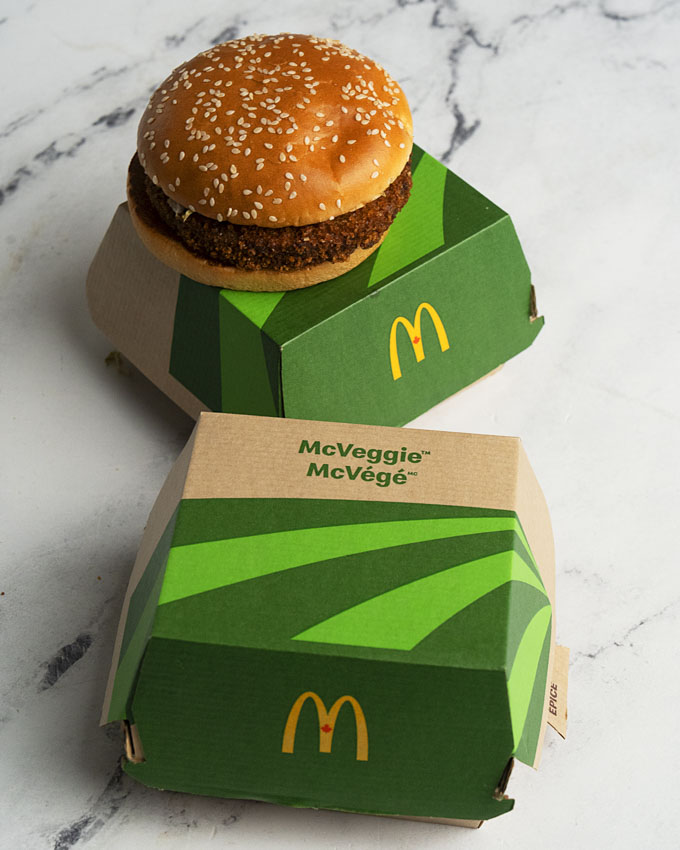 Designed for Canadian tastes, the sandwich is made with a breaded vegetable patty containing carrots, green beans, zucchini, peas, soybeans, broccoli, and corn. The patty is paired with shredded lettuce and a mayo-style sauce on a toasted sesame bun.