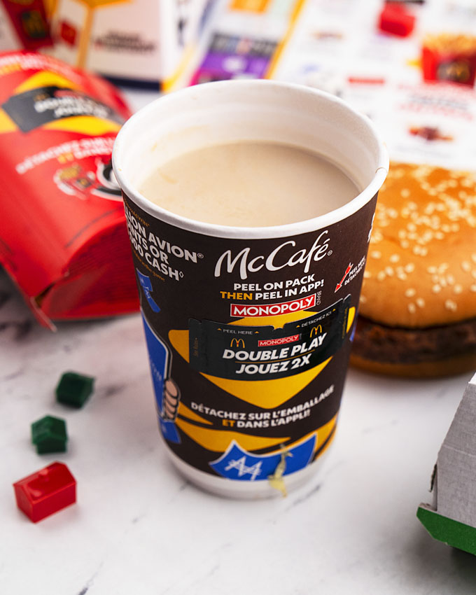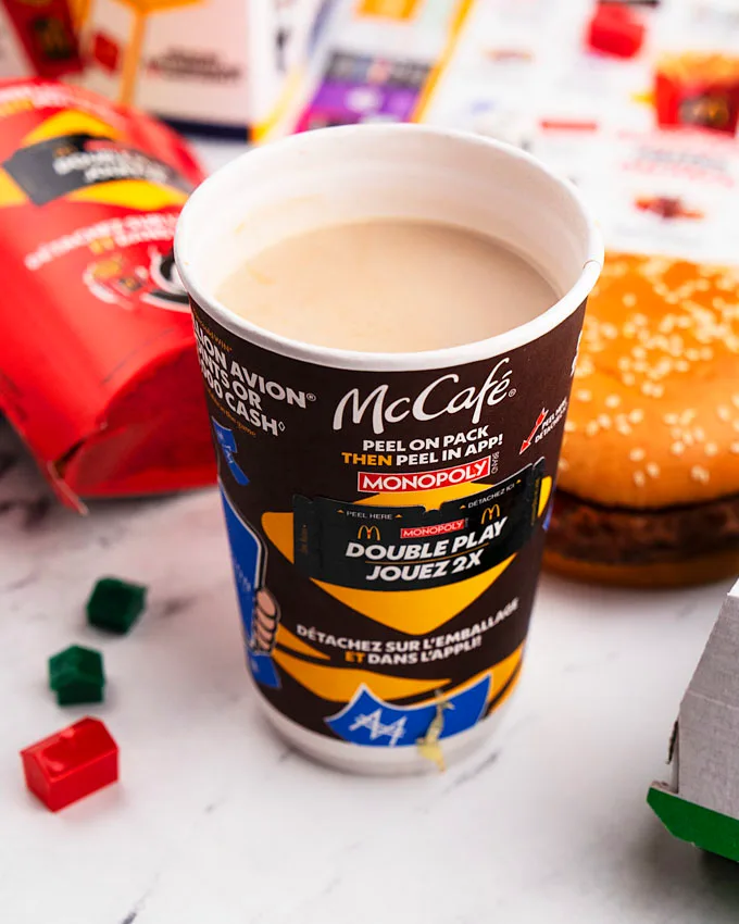 Earlier in this post, I shared the full list of eligible McDonald’s Monopoly menu items. The most affordable options that come with Game Pieces would probably be Hash Brown, Medium Premium Roast Brewed Coffee, or Medium Tea (prices vary by location). For example, I once ordered 10 Hash Browns through Uber Eats and received 20 Game Stamps, two of which were instant wins for a Small Hot McCafé Beverage!