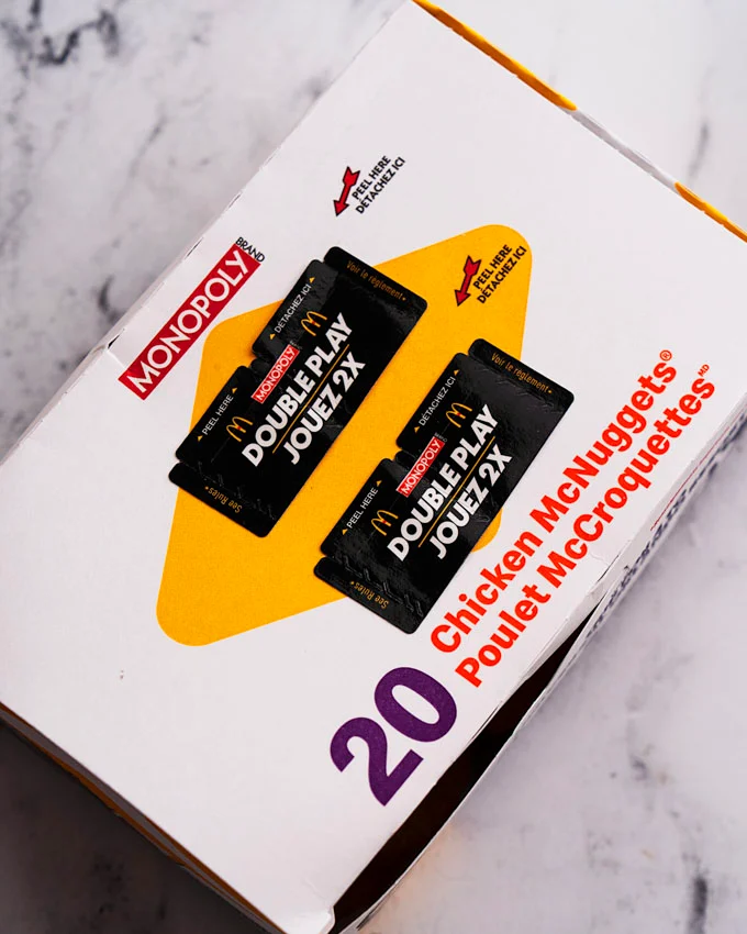 Each of the following specially marked food and beverage items on the McDonald’s Canada menu come with 1 Game Piece (2 Game Stamps). The exception is the 20-piece McNuggets which come with 2 Game Pieces (4 Game Stamps). Here is the list of specially-marked food and drink items available for the 2025 Monopoly Double Play Game at McDonald’s: