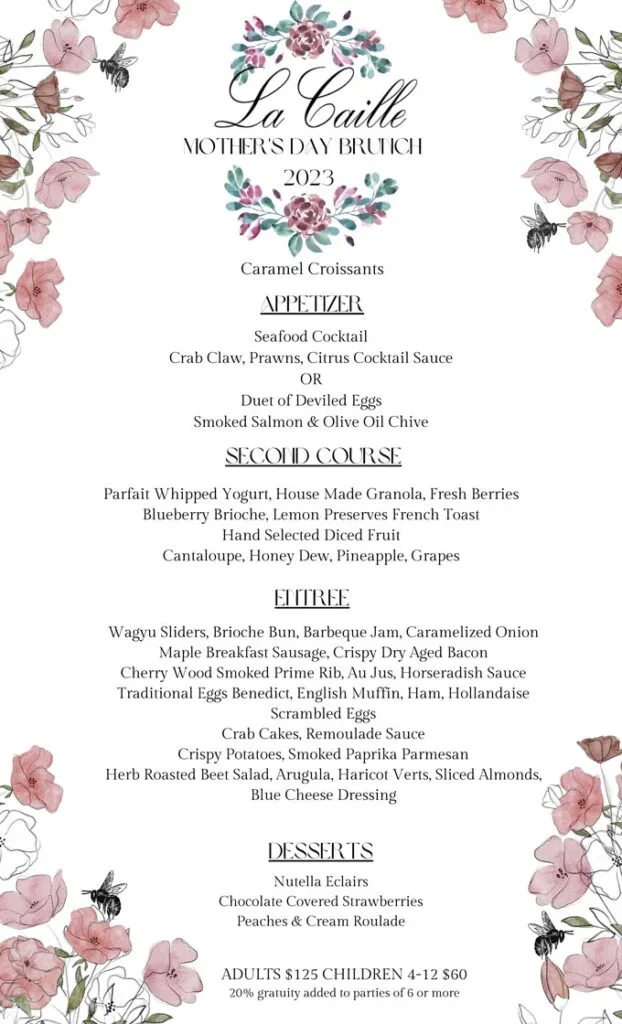 La Caille Restaurant (Sandy) is offering a Mother’s Day family style brunch on May 14. Priced at $125 per adult, children 4 – 12 $60.