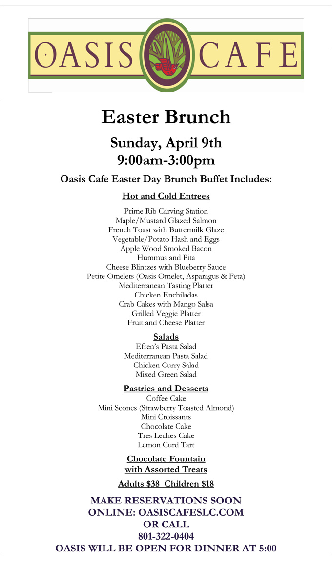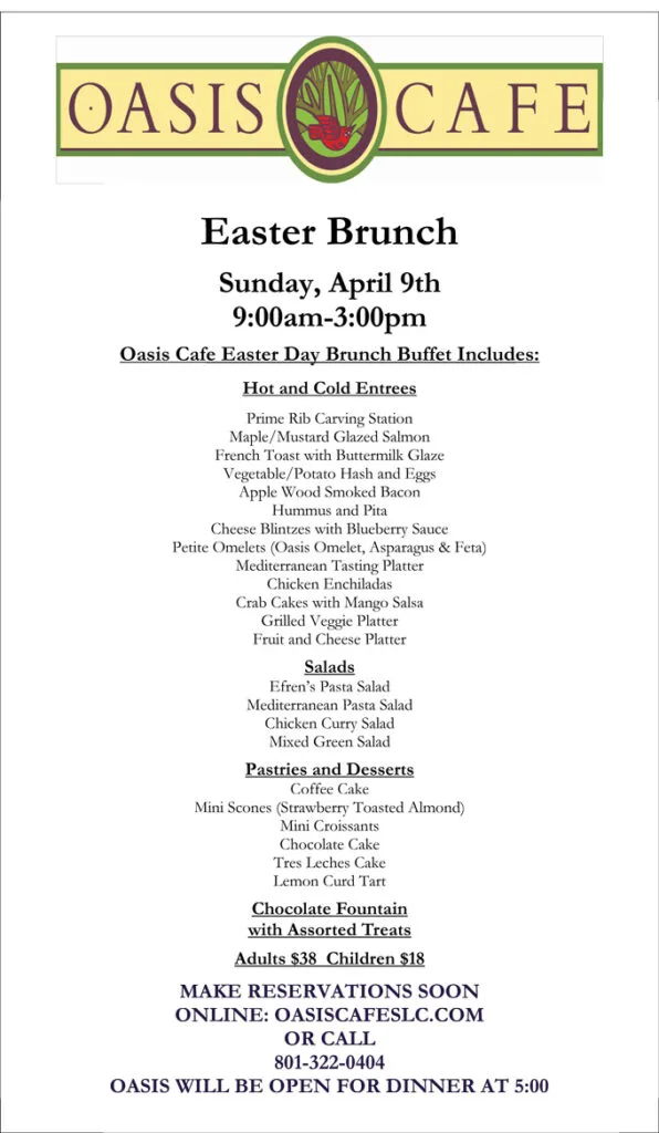 Oasis Cafe – Salt Lake City is offering a Mother’s Day buffet on May 14. Priced at $38 per person.