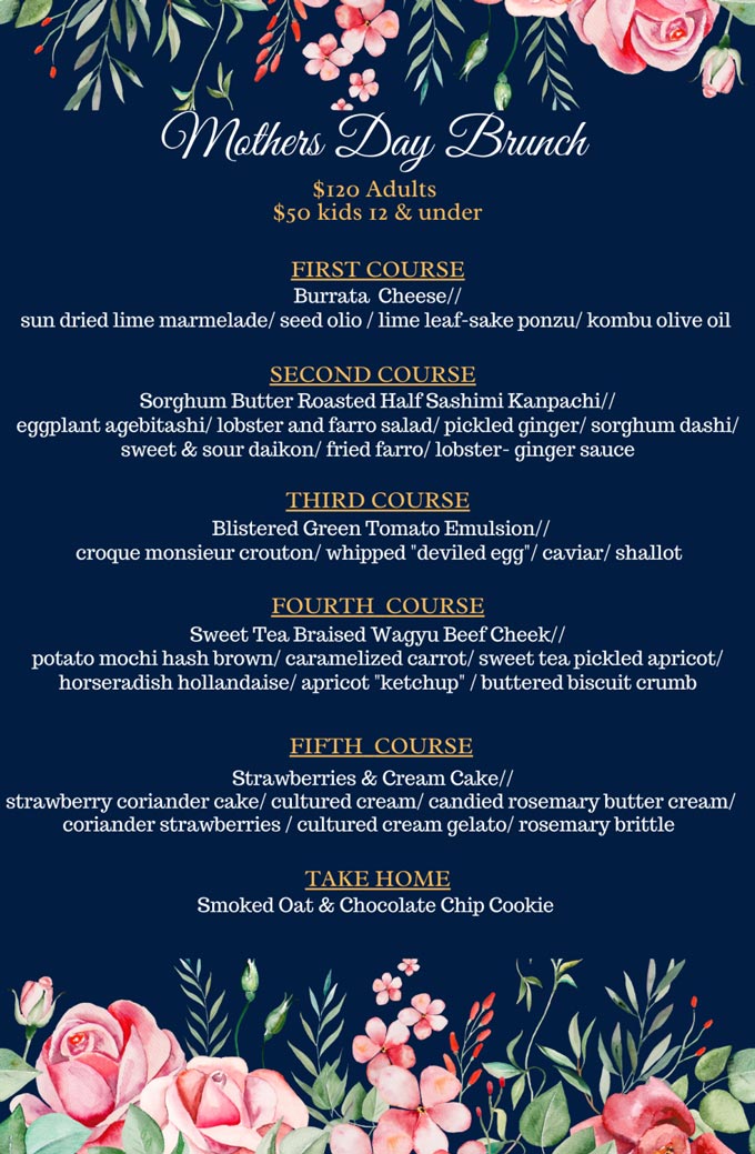 Franck’s is offering a Mother’s Day 5-course prix-fixe menu on May 14 from 11:00 am – 4:00 pm. Priced at $120 per person, $50 kids 12 and under.