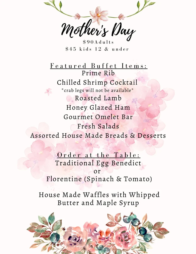 Kimi’s Chop & Oyster House is offering a Mother’s Day brunch buffet on May 14. Priced at $84.50 per adult, $28 per child ages 6-11, $14 per child ages 3-5 and free for children age under 3. The buffet includes: