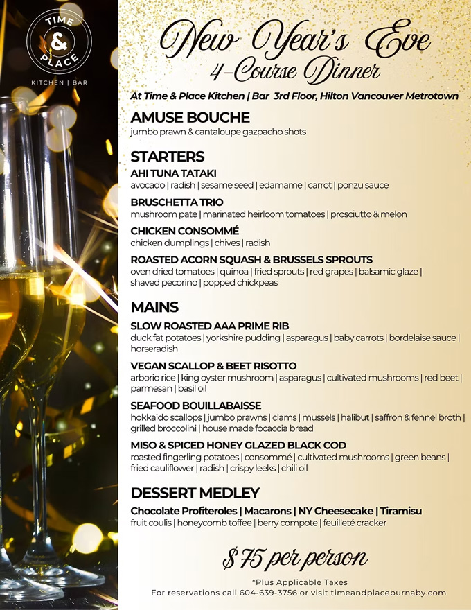 Time & Place in Burnaby is offering a New Year’s Eve 4-Course Dinner, priced at $75 per person.