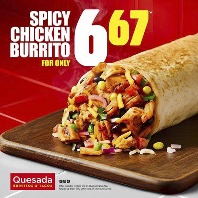 The offer gives customers a chance to enjoy Quesada’s spicy chicken burrito at a reduced cost, making it an easy option for lunch, dinner, or a quick meal on the go. The smaller burrito keeps the familiar flavours intact while offering a more budget-friendly choice.