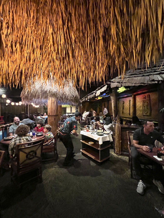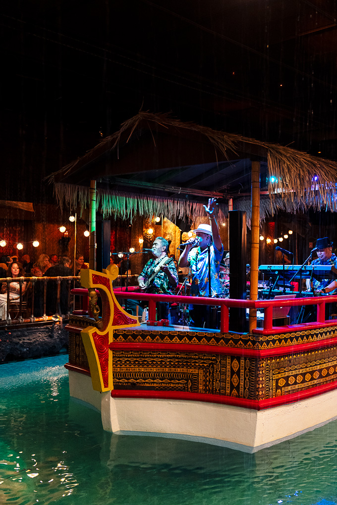 The interior is adorned with tiki statues, bamboo accents, thatched roofs, and a lagoon with floating stages.
