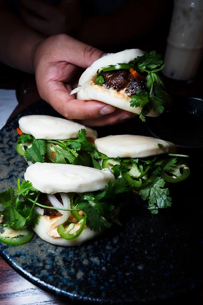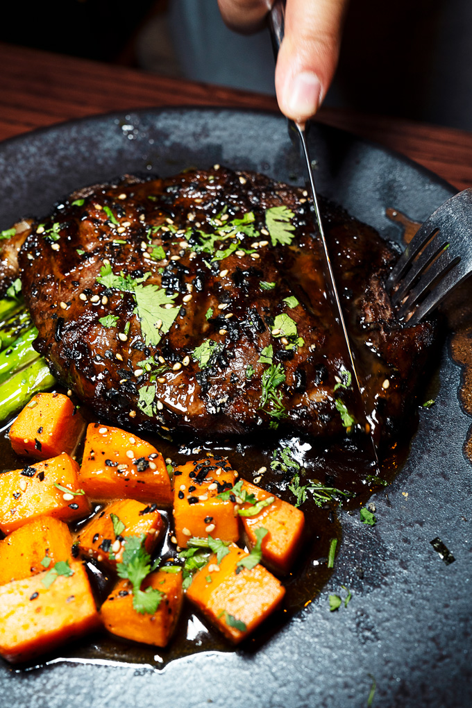 Oyster Sauce Glaze, Charred Purple Yam, Grilled Asparagus, Coriander