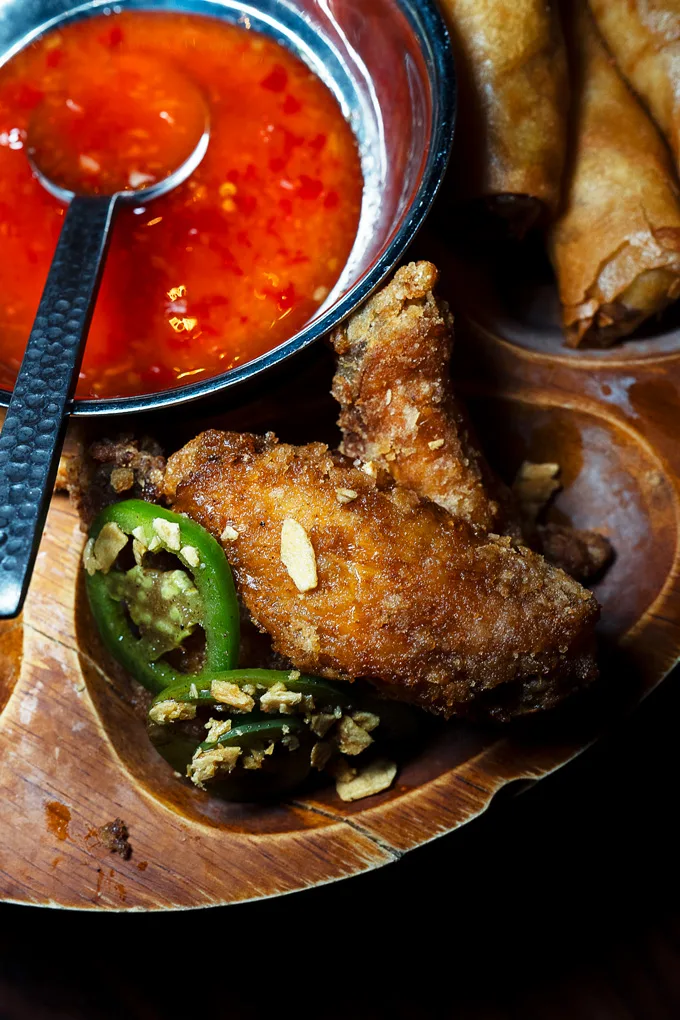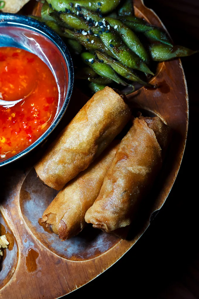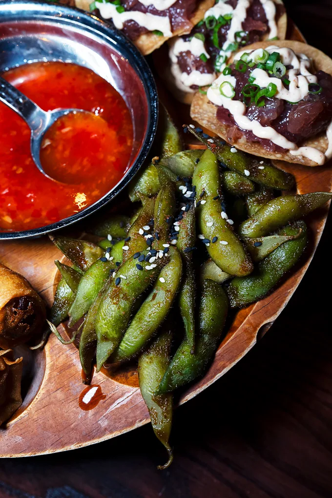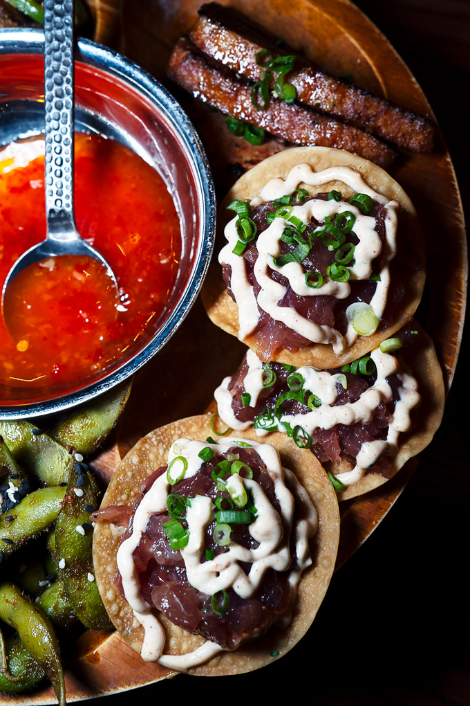 Fried Vegetable Spring Rolls, Ahi Tuna Poke Tostadas, Chili Pepper Chicken Wings, House Made Spam, Edamame