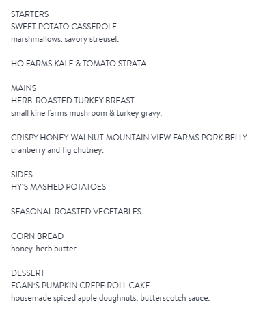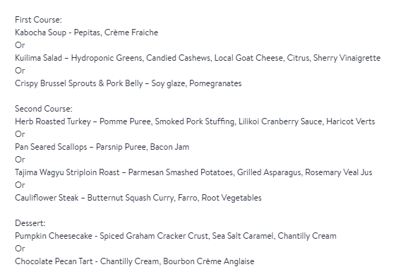 Alaia in Kahuku is offering a three-course Thanksgiving dinner on November 27, $185 per adult and $85 for children 12 and under. Starters include kabocha soup or Kuilima salad or crispy Brussels sprouts with pork belly; mains include herb roasted turkey with smoked pork stuffing and lilikoi cranberry sauce or pan seared scallops or Tajima Wagyu striploin roast or cauliflower steak; desserts are pumpkin cheesecake or chocolate pecan tart.