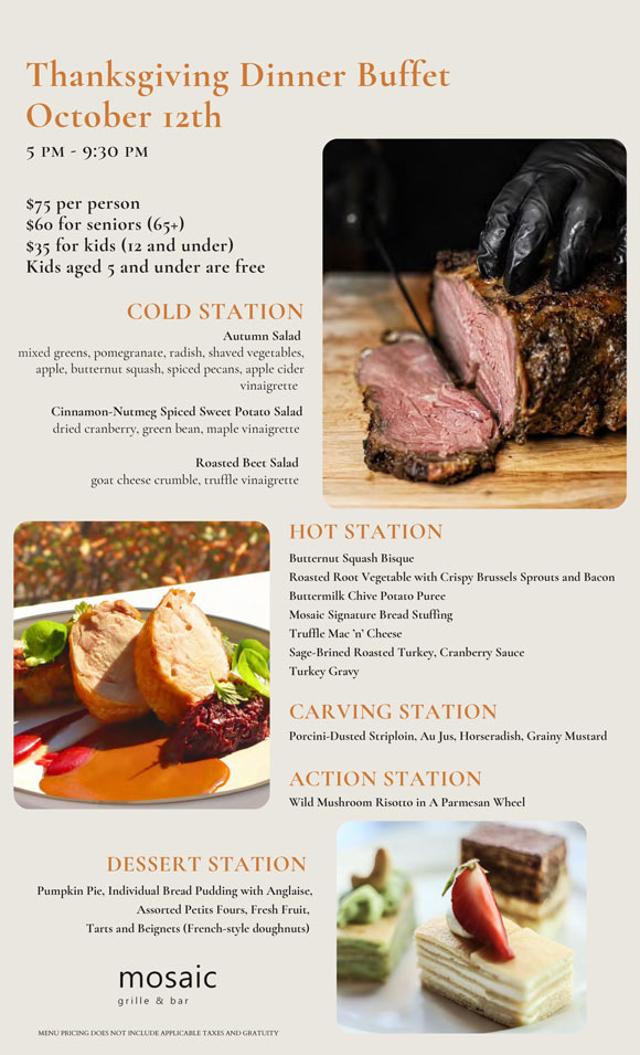 - On October 12, a Thanksgiving Dinner Buffet will be available for $53 per adult, $49 per senior, and $26.50 per child 12 and under. The buffet includes salads such as Caesar, Fall Harvest, and Beet & Arugula, entrees including marinated free range turkey, traditional baked ham carvery, glazed maple soy salmon, Thai green curry, penne rose, Yukon mashed potatoes, and roasted root vegetables. Dessert includes a seasonal fruit platter, mini desserts, and signature coffee and tea. Prices exclude beverages, taxes, and gratuities. Reservations are required.
