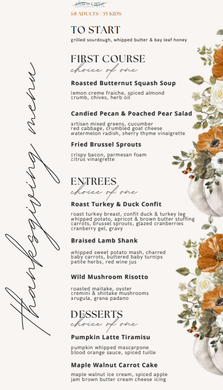 Showcase Restaurant & Bar in Vancouver is offering a three-course Thanksgiving dinner October 11 to 13 for $68 per adult and $35 per child.