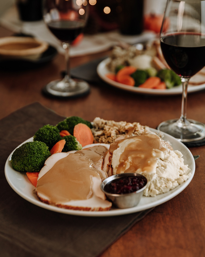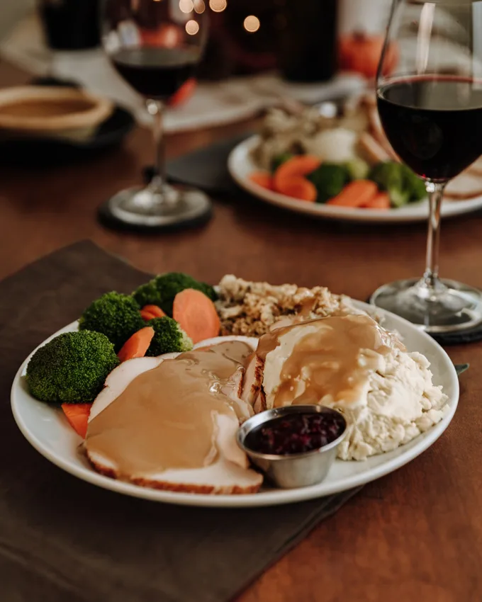 This option features tender turkey breast served with classic sides like mashed potatoes, stuffing, carrots, and broccoli. It’s topped off with cranberry sauce and rich turkey gravy—a complete meal that’s ready for you at the restaurant or for pickup and delivery to enjoy in the comfort of your own home.