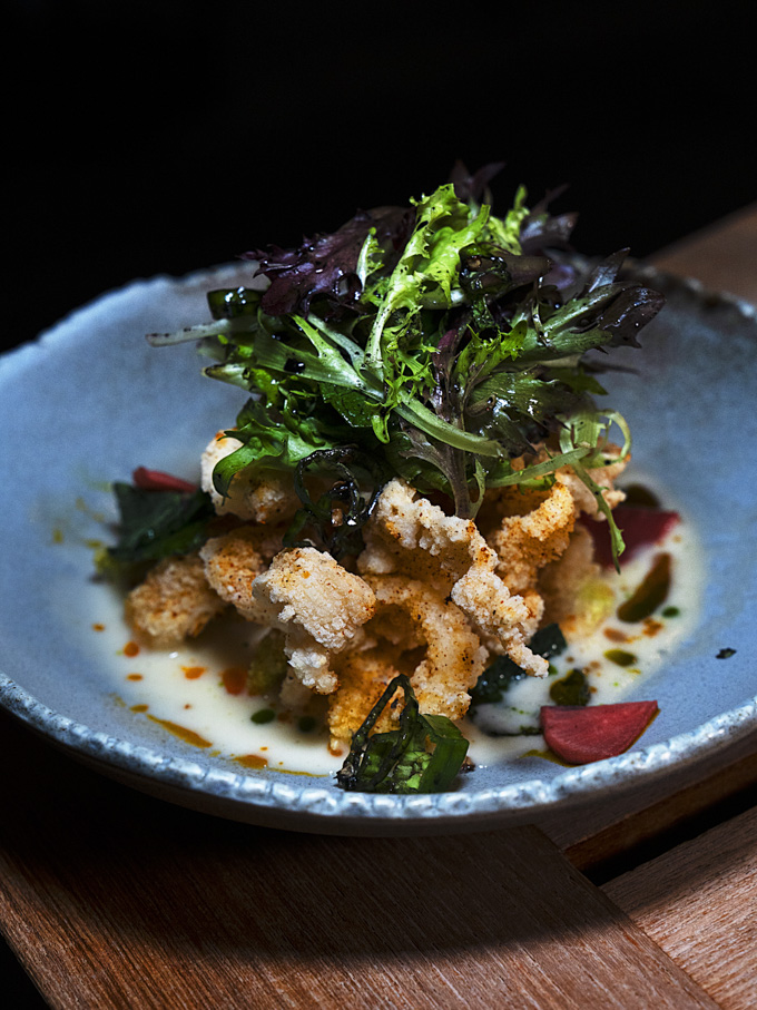 Crispy fried squid served with dashi sauce, greens, and pickled radish. The squid comes out crisp and tender, while the savoury sauce and pickles keep the dish lively.