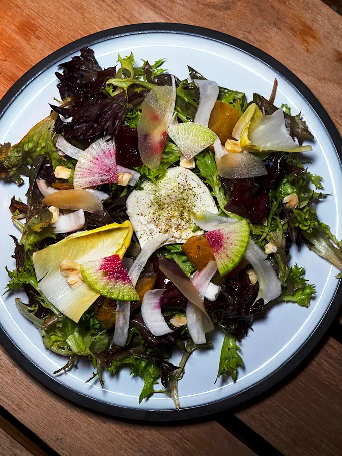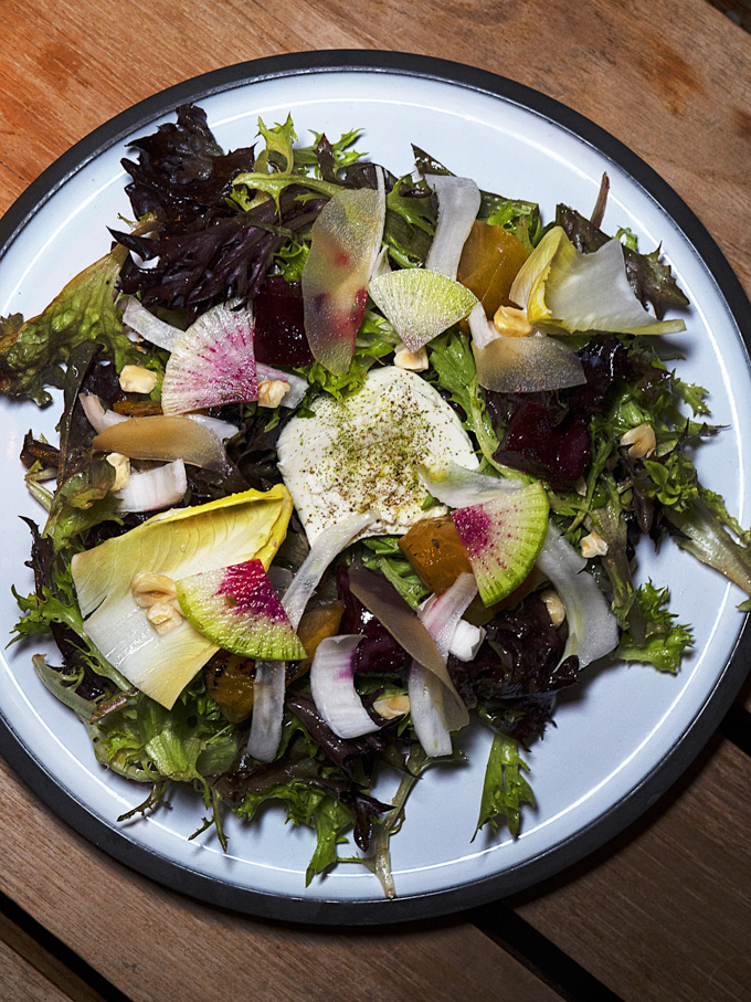 Burrata with grilled beets, greens, fennel, apples, and roasted hazelnuts. The creamy cheese balances the sweet beets, while apples and nuts add texture that keeps each bite interesting.
