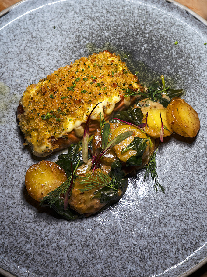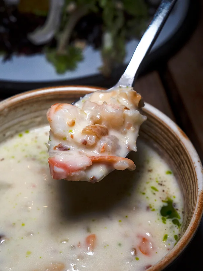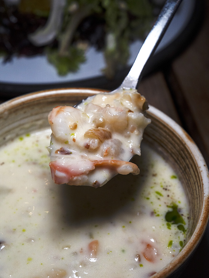 Smoked sablefish, mixed seafood, double-smoked bacon, chive oil in a hearty chowder packed with seafood. The smoked fish adds a savoury note, and each spoonful feels generous and comforting.