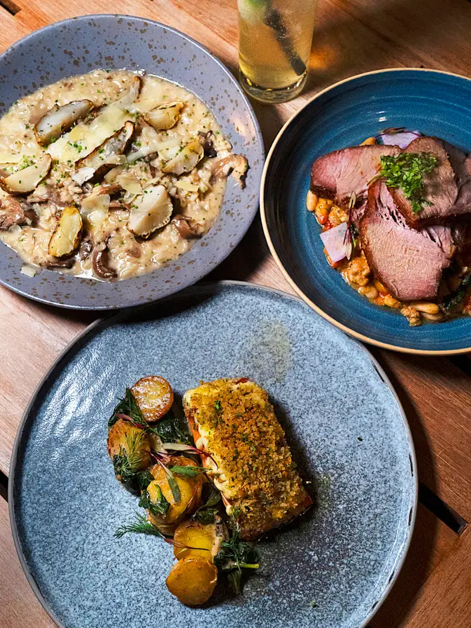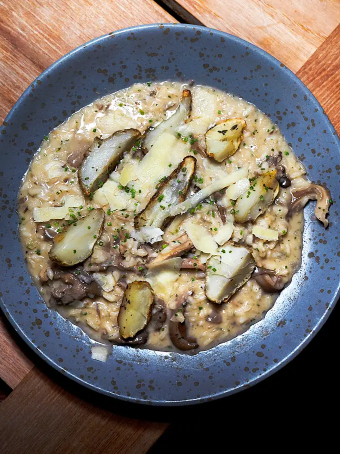 Creamy risotto with sautéed mushrooms, sunchoke, and parmesan, delivering comforting mushroom flavour throughout and making this a satisfying vegetarian option.