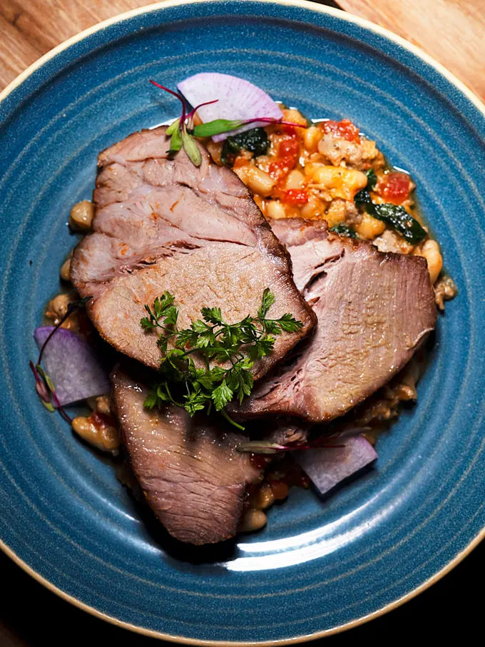 Tender pork collar with BBQ koji glaze, served with fennel sausage and white bean cassoulet, tomatoes, and braised kale. The cassoulet makes this a filling dish, while the vegetables help lighten the plate.