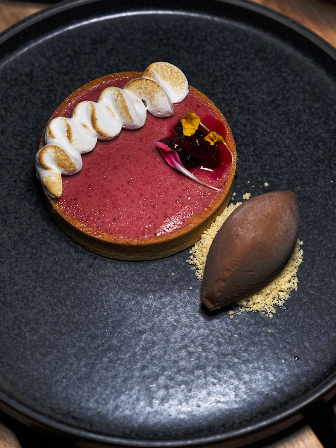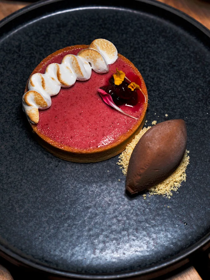 Cherry custard tart with poached cranberries and chocolate semifreddo, combining tart fruit flavours with creamy chocolate for a satisfying dessert.