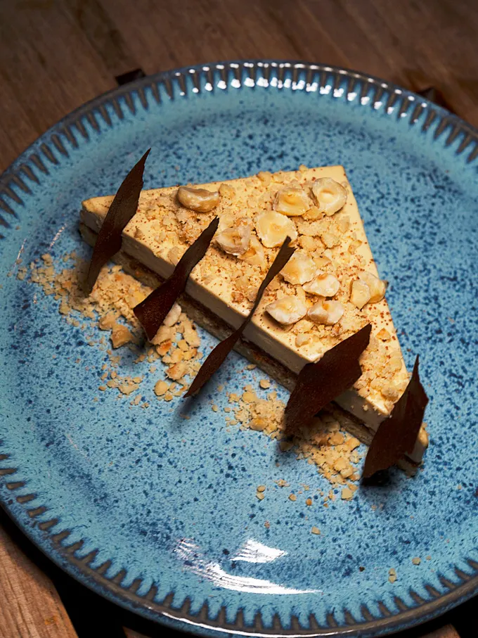 Brown sugar mousse cake with hazelnut crunch and sponge cake, offering smooth texture with a pleasant crunch and a finish that is not overly sweet.