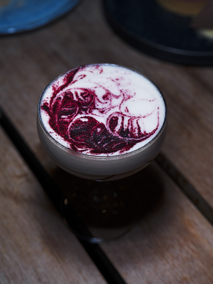 Dr. Zero non-alcoholic Amaro, Sobrii 0-Rum, allspice syrup, citrus, egg whites, aromatic bitters